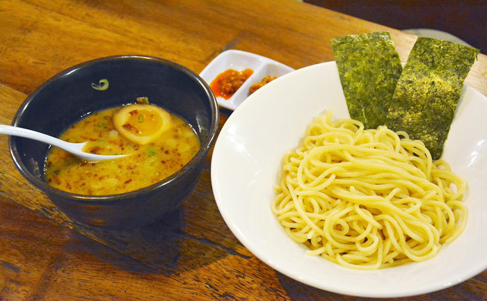 ↓豚骨のつけ麺 Rp.58,000。写真では沈んでみえませんが、スープにはチャーシューも入っています。こちらも太麺を使用しています。ラーメンのつけ麺、初めての経験でした(笑)