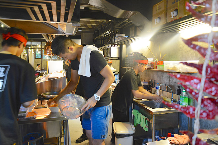 ↓ オープンスタイルの厨房では、男性スタッフが真剣な表情で働いています。