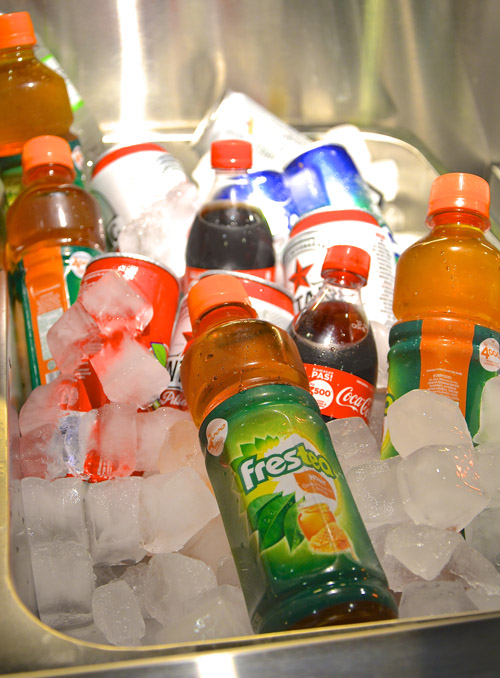 ↓飲み物はこんな風に氷の中に水やお茶、ビールの缶やボトルが無造作に突っ込まれています。なんか縁日の露店風でいいですね〜。