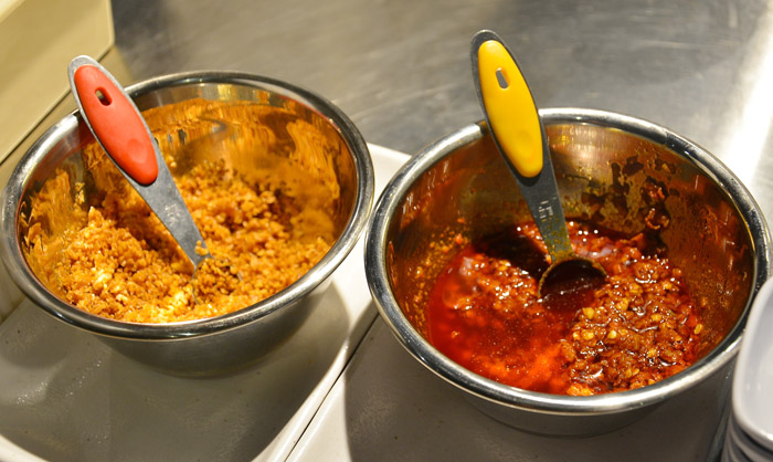 ↓レジの横には辛さを調節できるよう、チリがどんぶりいっぱい置いてあります。