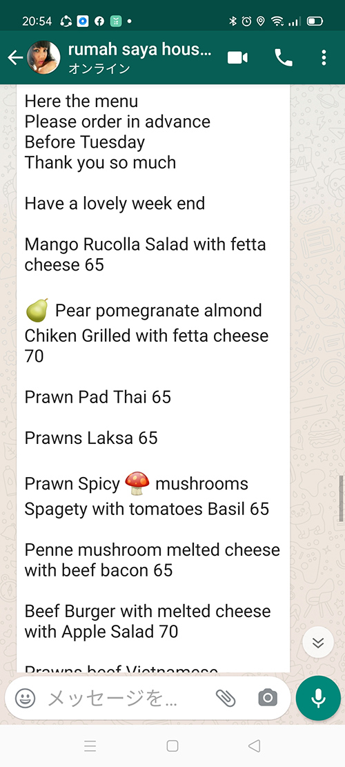 WhatsAppでメニューが7〜8つほど送られてきますので、そこからチョイス!