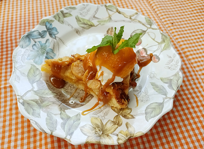 本日のデザートは、ピーチアーモンド ソルティ キャラメルガレット サーブド with アイスクリーム。