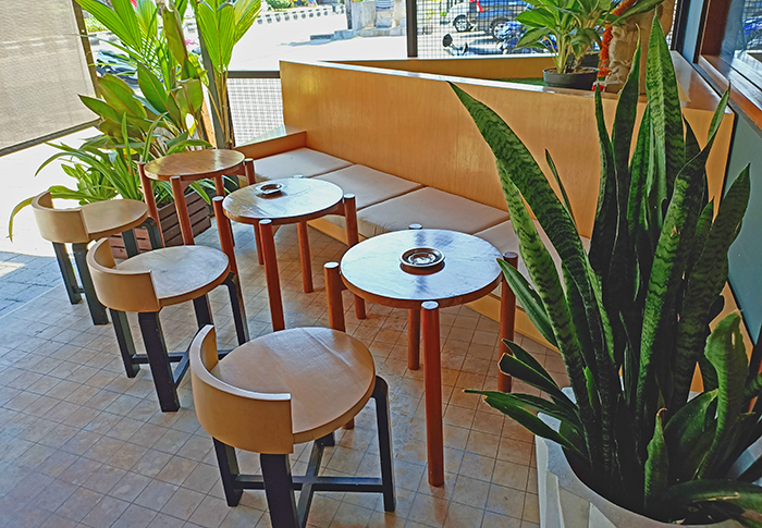 入ってすぐのこぢんまりとしたテラス席。丸型の椅子やテーブルがちょっとお茶目な感じです。