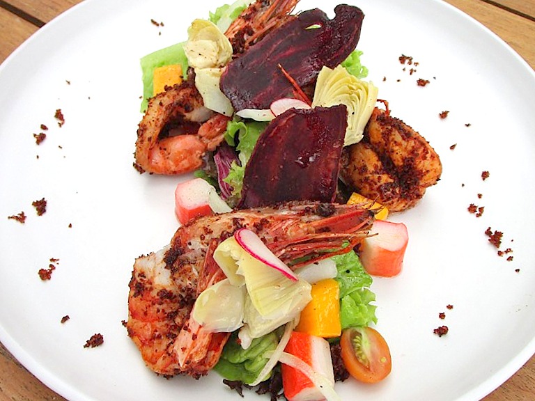 ケイジャンの味がしっかりついた海老がごろんと。アンティチョーク、トマト、マンゴ、紫いものチップ、等と一緒にレモンハニードレッシングで頂きます。それぞれが美味しい素材が組み合わさります。