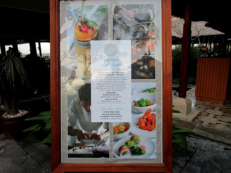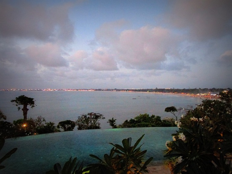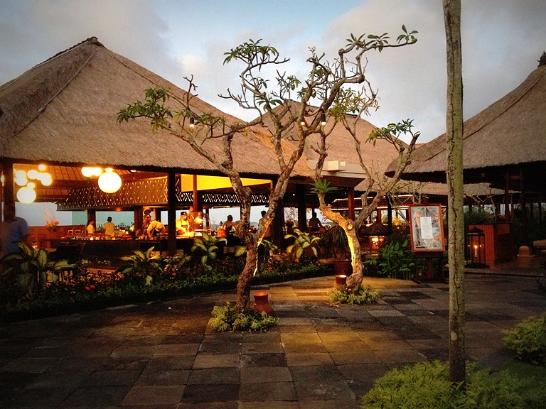 タマンワンティランは砂浜からは少し上がったところにあるので、ジンバラン湾が見渡せ、穏やかなさざ波、空港に着いたり飛んで行く飛行機の灯り、イカンバカールからの煙や遠くはチャングーの方?キラキラ光るバリの街、ここから見える景色はそれはそれは格別なものなのでした。水色だった空が少しずつ紺色へと変わり街の灯りと星が輝きだす、その様子をずっと見ていることが出来る、タマンワンティラン。ディナータイムは、18:00PMオープンですが、少しだけ早めに到着して是非1日の終わり、トワイライトタイムを過ごしてみて下さい。