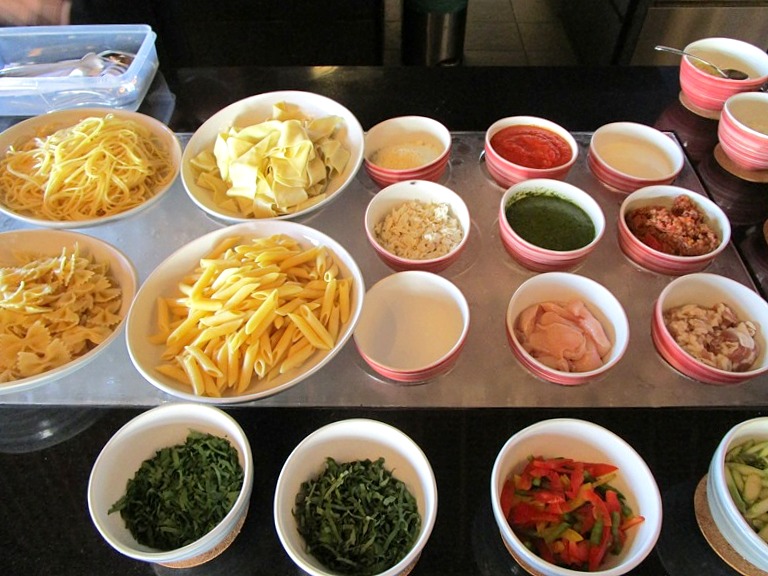 カスタムパスタコーナー。この種類の多さにテンションあがってどれを頼んだらいいのか分からなくなりました。