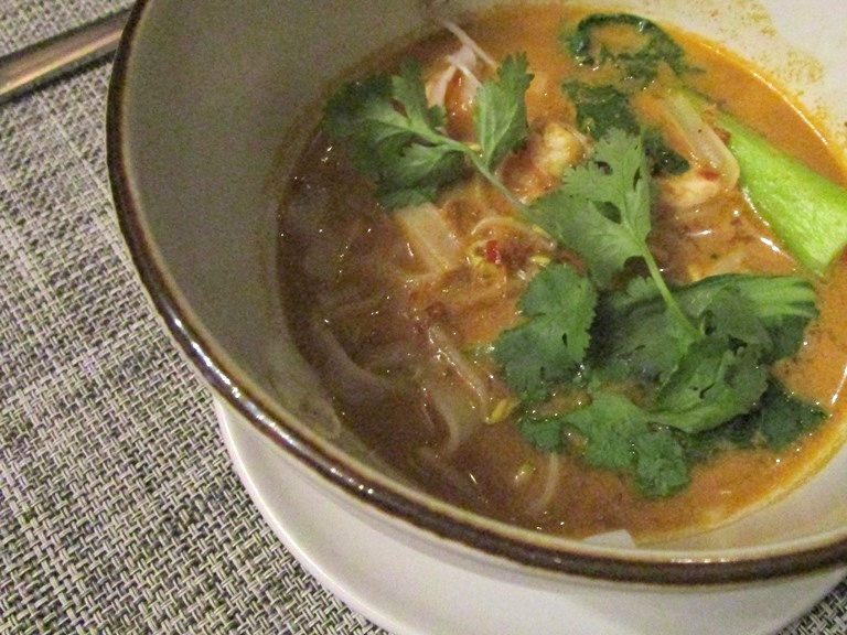 トムヤムとラクサが人気、とのことだったのでもやしや青梗菜等野菜をもりもりに、と海老、イカ、蟹を入れてラクサを注文。最後にパクチーをのせて。美味し♡