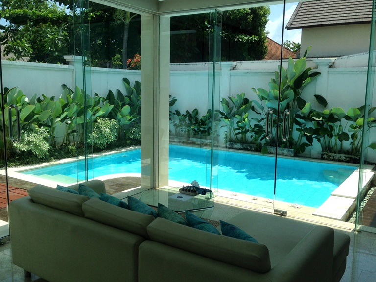 入り口を入るとリビング越しに涼しげなプールが目に飛び込んでくる素敵なヴィラ♥♥