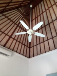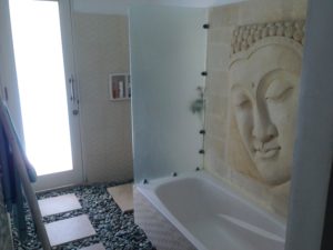 マイケル氏のマッサージルームからは、プールにも出られ天井が高く開放的です。