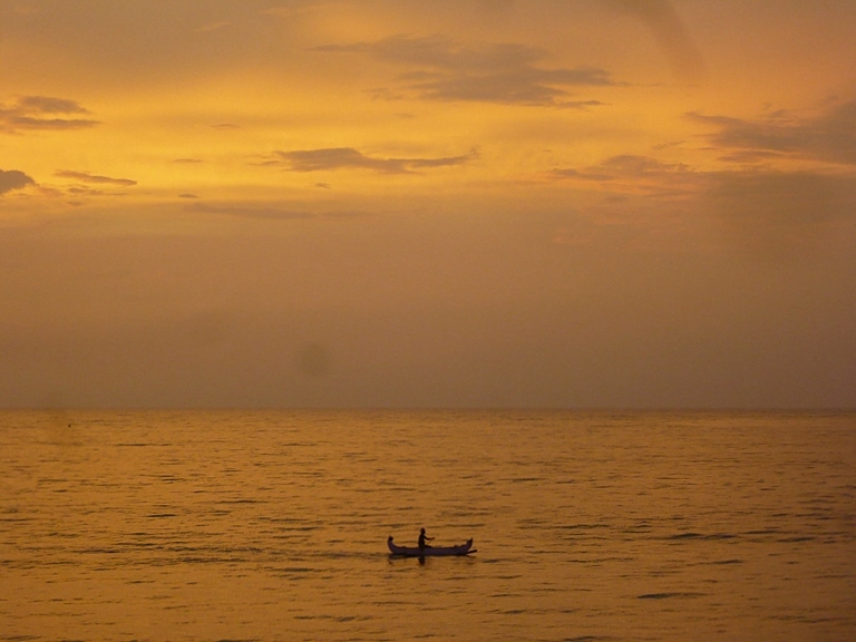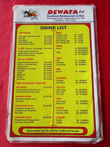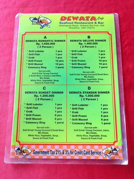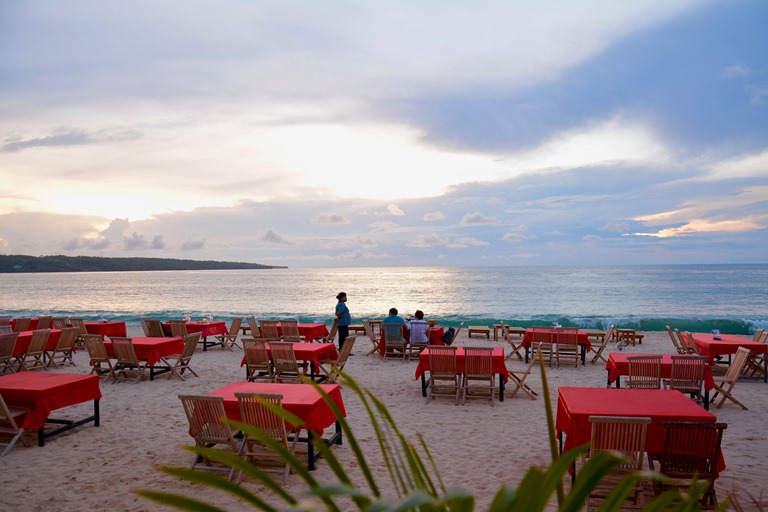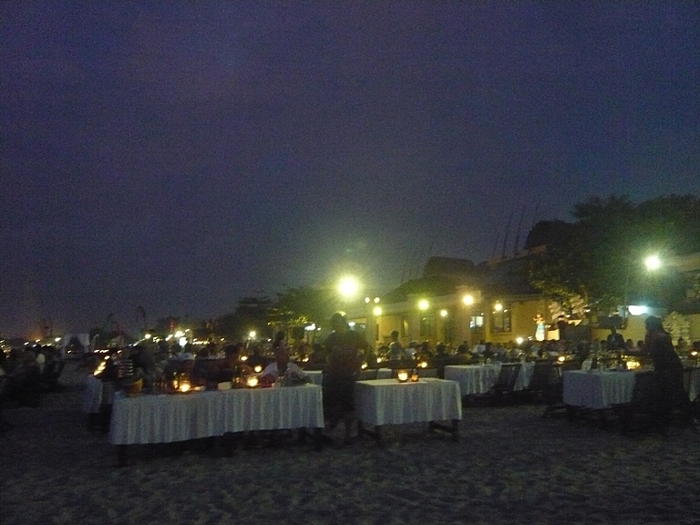漁船の灯り、空港のライトが海にキラキラと映り…月を眺めながら、波の音が耳に心地よく、夜空の下バリ島の夜がふけていきます。海辺でいただく魚とサンバルの味は格別なもの。こういう地元の雰囲気の中でのお食事というのはやっぱりいいものですね。