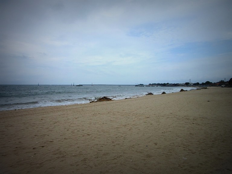 ジンバラン湾の穏やかな海面、右手にはひっきりなしに飛行機が離発着する空港がよく見えます。海側から飛んでくる日もあれば、スランガン側から到着する日もあります。