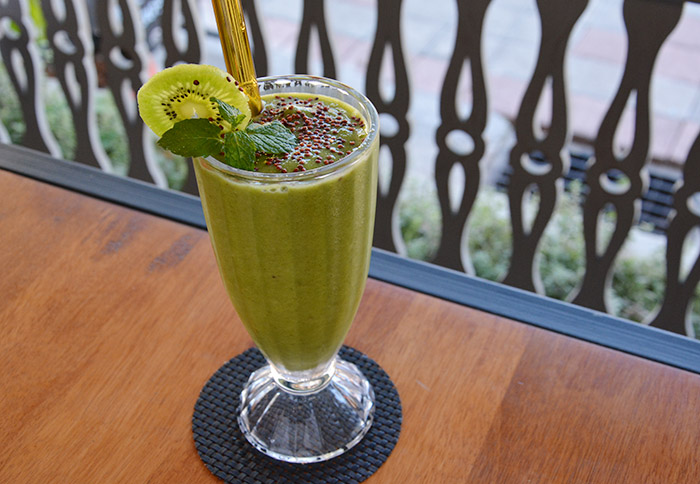 ↓グリーンスムージーRp.25,000はマスタードスピナッチ、バナナ、グリーンアップル、アーモンドミルク、蜂蜜が材料。全然青臭くなく美味しいです。