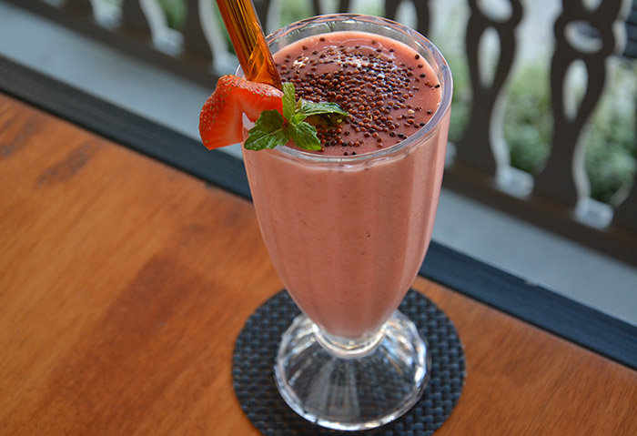↓ストロベリースムージーRp. 30,000。いちご、バナナ、アーモンドミルク、ココナッツウォーターが材料。文句なしに美味しい!あ、スムージーの上にトッピングされている粒つぶは、なんとスーパーフードのキヌアです!