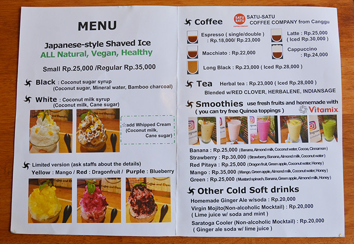 かき氷はブラックとホワイトの2種類とリミテッドバージョン(季節もの)3種類の、トータル5種類。サイズはスモールRp.25,000とレギュラーRp.35,000があります。