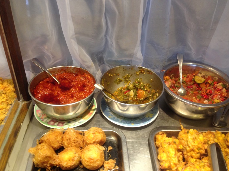 いつも3種類の色々なサンバルがあります。今日は向かって左からサンバルメラー、サンバルヒジョウ、ダブダブ、みなっしーは、生トマトの角切りが入っているダブダブが好きです。