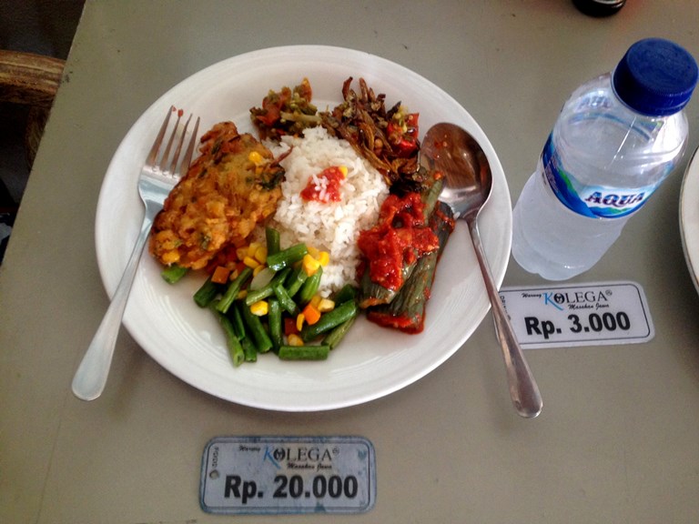 手前から時計周りに…カチャンパンジャン(インゲンの炒め物)、トウモロコシのかき揚げ、イカンツゥリー(小魚とピーナッツ)、サンバルテロン(茄子のサンバル和え)、ミネラルウォーターRp 3,000。