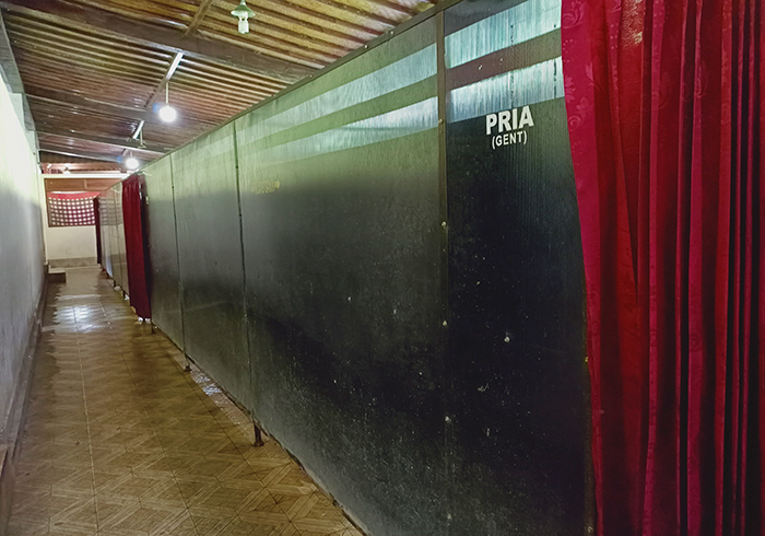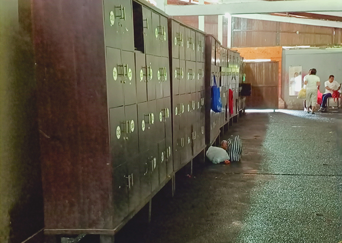 更衣室はざっくりと男女に分かれているだけです。写真手前のPRIAと書いてあるのは男性用の更衣室。中は仕切りがあるわけでもなく、いうならば大衆浴場の脱衣場のイメージ。笑