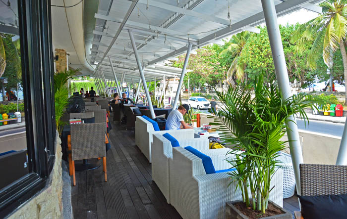 ↓クタビーチが見える、道路脇のテラス席もあります。パンタイクタ通りを歩く人の人間ウォッチングも楽しいかも。