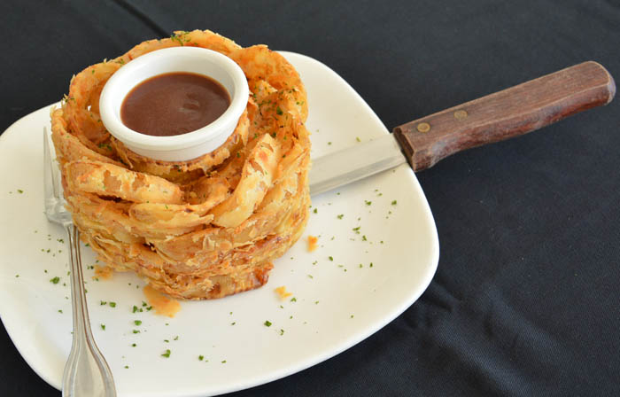 ↓こちらもスタッフおすすめのオニオンローフRp.75,000。カンタンにいうとオニオンリングを型にひとつずつきれいに積み重ねていき、一気に揚げたものです。熱でしっとりとしたタマネギのほんのりとした甘さとサクサクの衣が絶妙でした!トニーローマ特製のBBQソースをつけていただきます。
