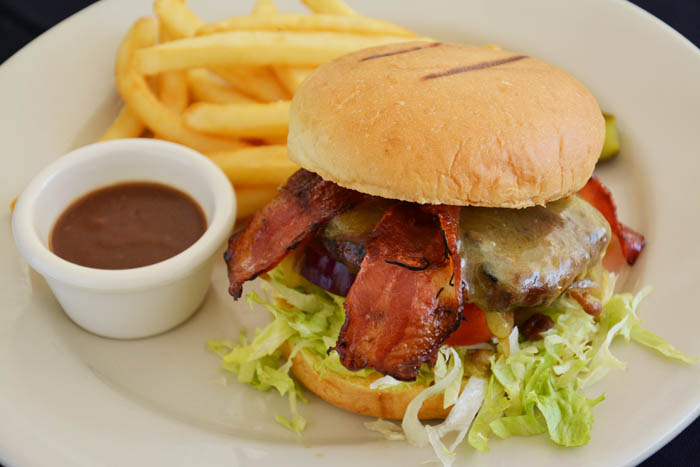 ↓ボリュームたっぷりのステーキハウスバーガーRp.210,000。牛肉100%のハンバーグにデミグラスソース、チーズ、ベーコン、野菜など、超モリモリ!