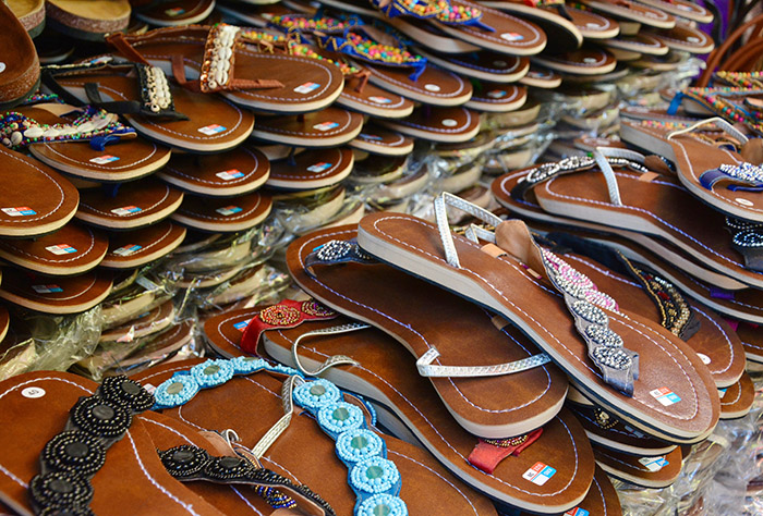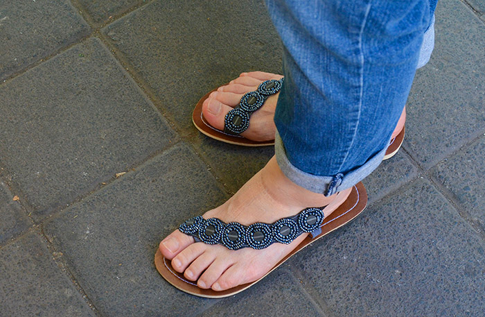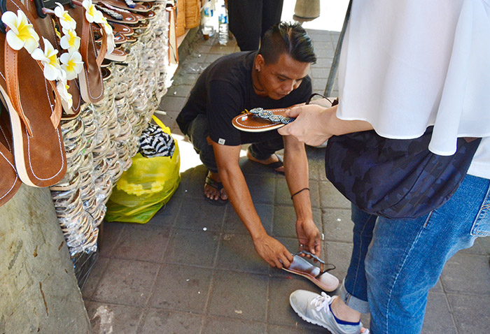 みんなお揃いでサンダルを買うことに。サイズを試します。値段は交渉制!言い値の半額以下まで頑張って値切りましたよ〜!笑
