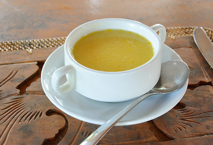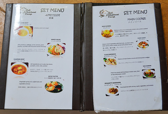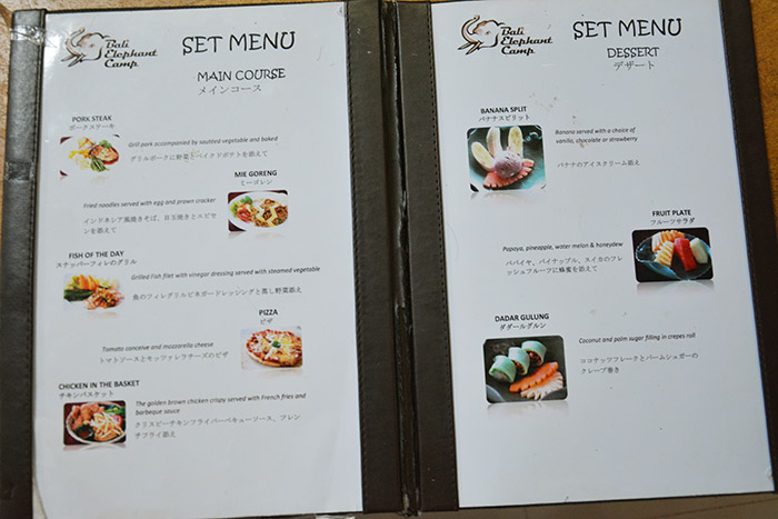 ちょうどランチタイムに到着したので、先にランチをいただいてから象乗りすることに。ランチメニューは前菜、メイン、デザートのそれぞれの中から好きなものをひとつずつチョイスします。