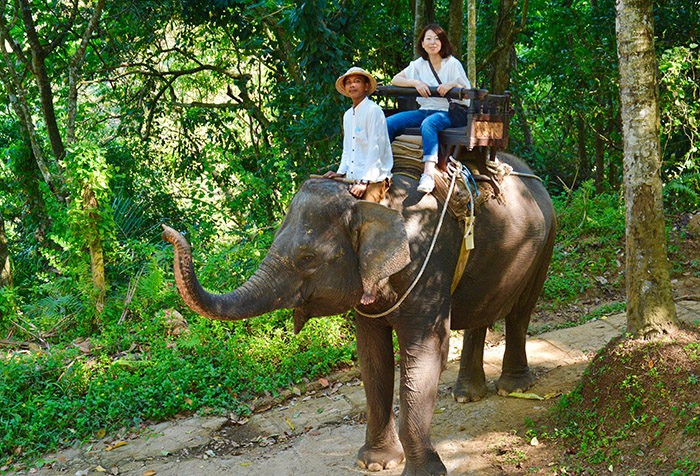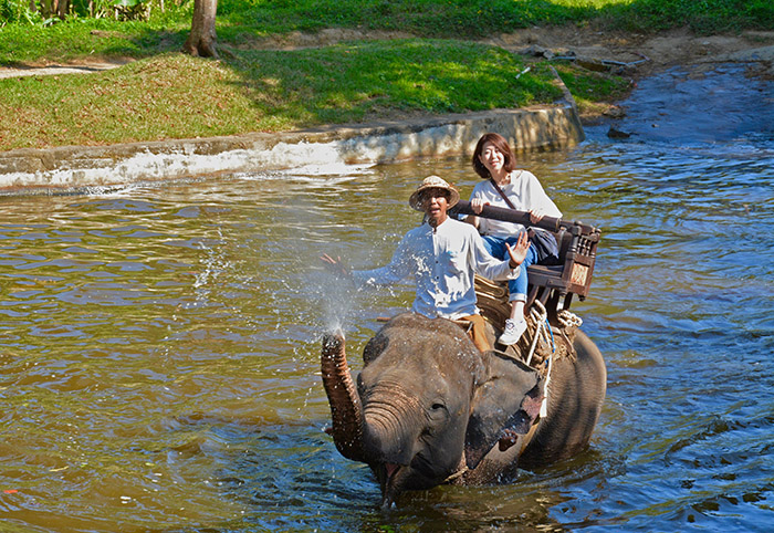 エレファントライドは約30分。ここには全部で15頭の象がいます。メスが10頭、オスが5頭。今回乗せてくれたセンセンとハッピーは両方ともメスです。