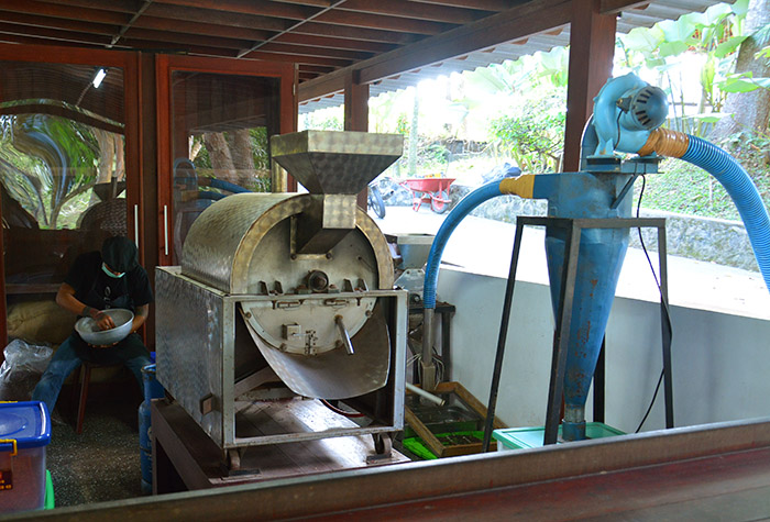 カカオの実からチョコの原料になる部分を機械を使って取り出します。