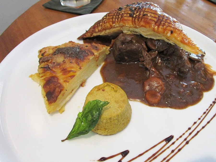 トラディショナルフレンチビーフシチュー、左はポテトのミニグラタン。