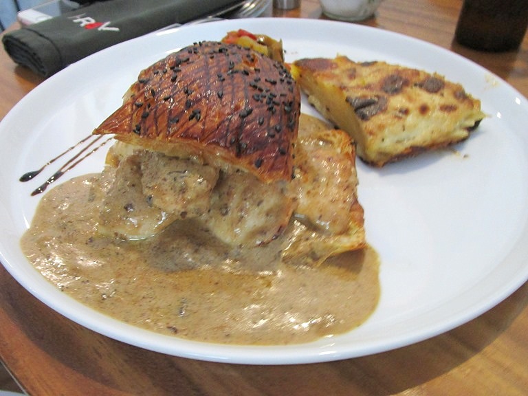 チキン、マッシュルームソース。グラタン、ラタトゥイユの野菜。特にソースが美味!