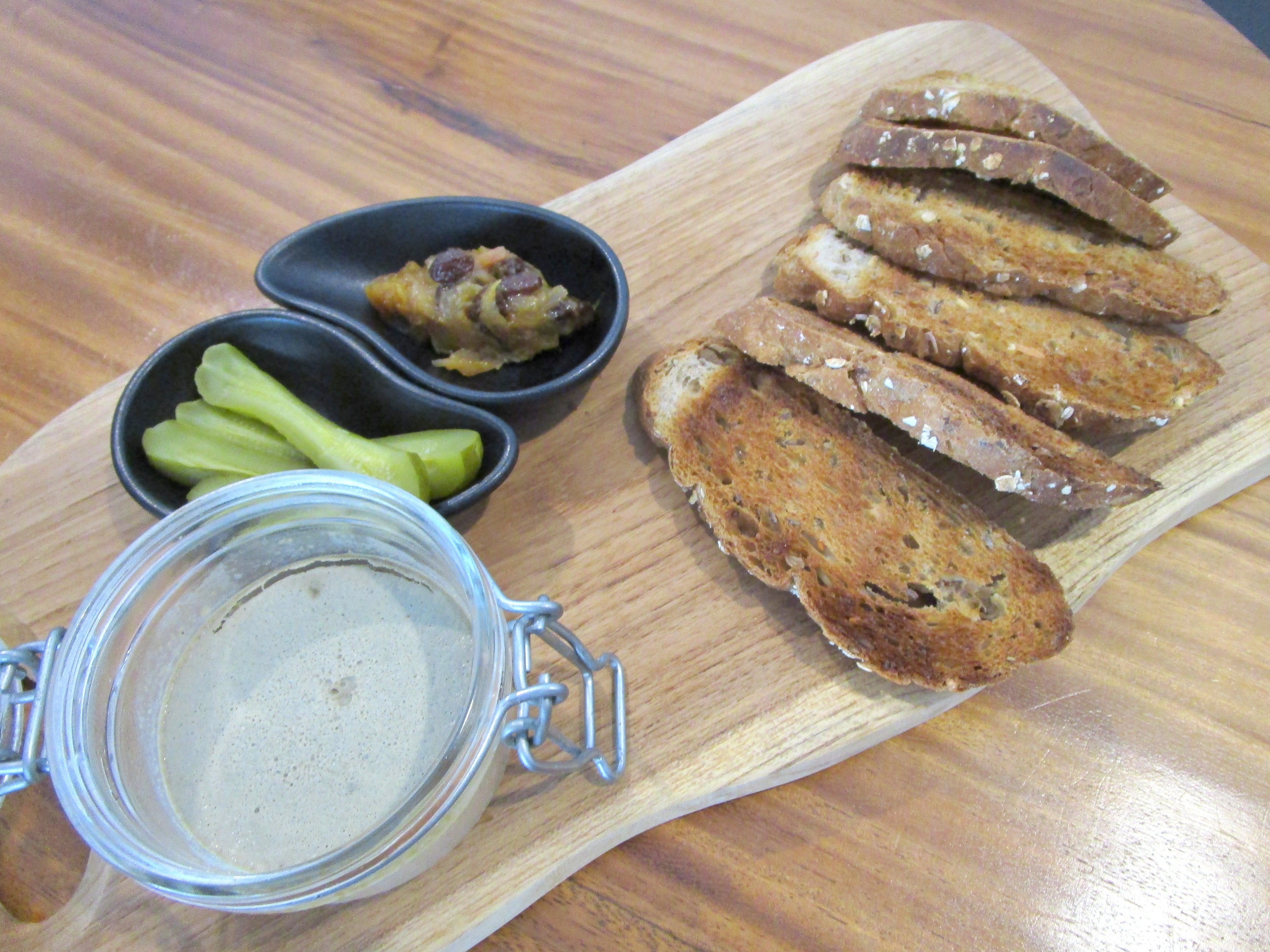 チキンレバーテリーヌ。トーストされたパンにレバーのペースト、甘いジャムのようなもの?ピクルスをのせて。