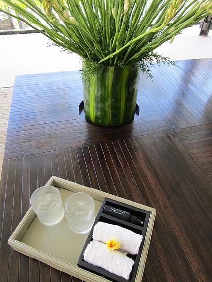 ウエルカムドリンク。冷たいおしぼりに、リフレッシュスプレー、暑いので顔や身体に吹きかける用。初めてシュッとやってみましたが気持ちいいですね、スプレー。