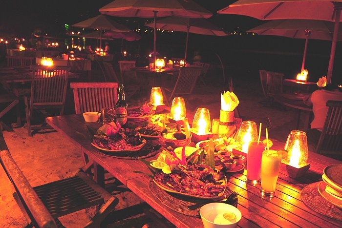 ・ジンバランビーチの屋台での名物イカンバカール(シーフードバーベキュー)