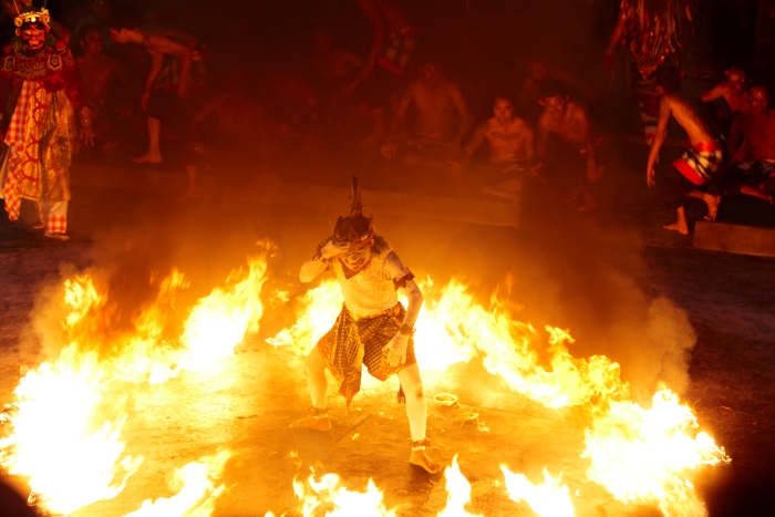 インドの叙述詩ラマヤナ物語のストーリーを上半身裸の男性たちが、独特の掛け声を発しながら展開する、人気の高いバリ舞踊の1つです。その「チャッ、チャッ、チャッ」という男性の掛け声が様々なリズムに変化し不思議なハーモニーとなり、すっかり日が暮れたラストは、ファイヤーダンスで一気に盛り上がります。