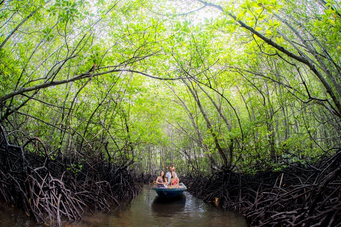 ガイドの説明を聞きながらキラキラと木漏れ日が綺麗なマングローブの森を小舟で移動していきます。
