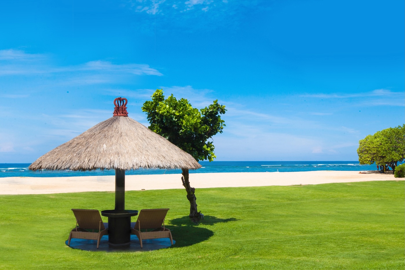 宮殿を思わせるようなプールや噴水、日替わりで試してみたい様々な各国料理が楽しめる数々のレストラン、伝統舞踊とインドネシア料理が楽しめるシアターもあり、南国の木々や花々が咲き乱れる美しい庭…そして、オンザビーチの眩しい砂浜と青い海、ただリゾートの中を散策するだけでも時空を越えたような感覚にもなります。