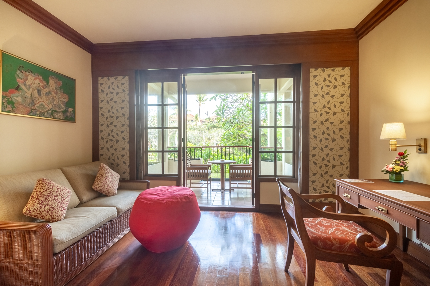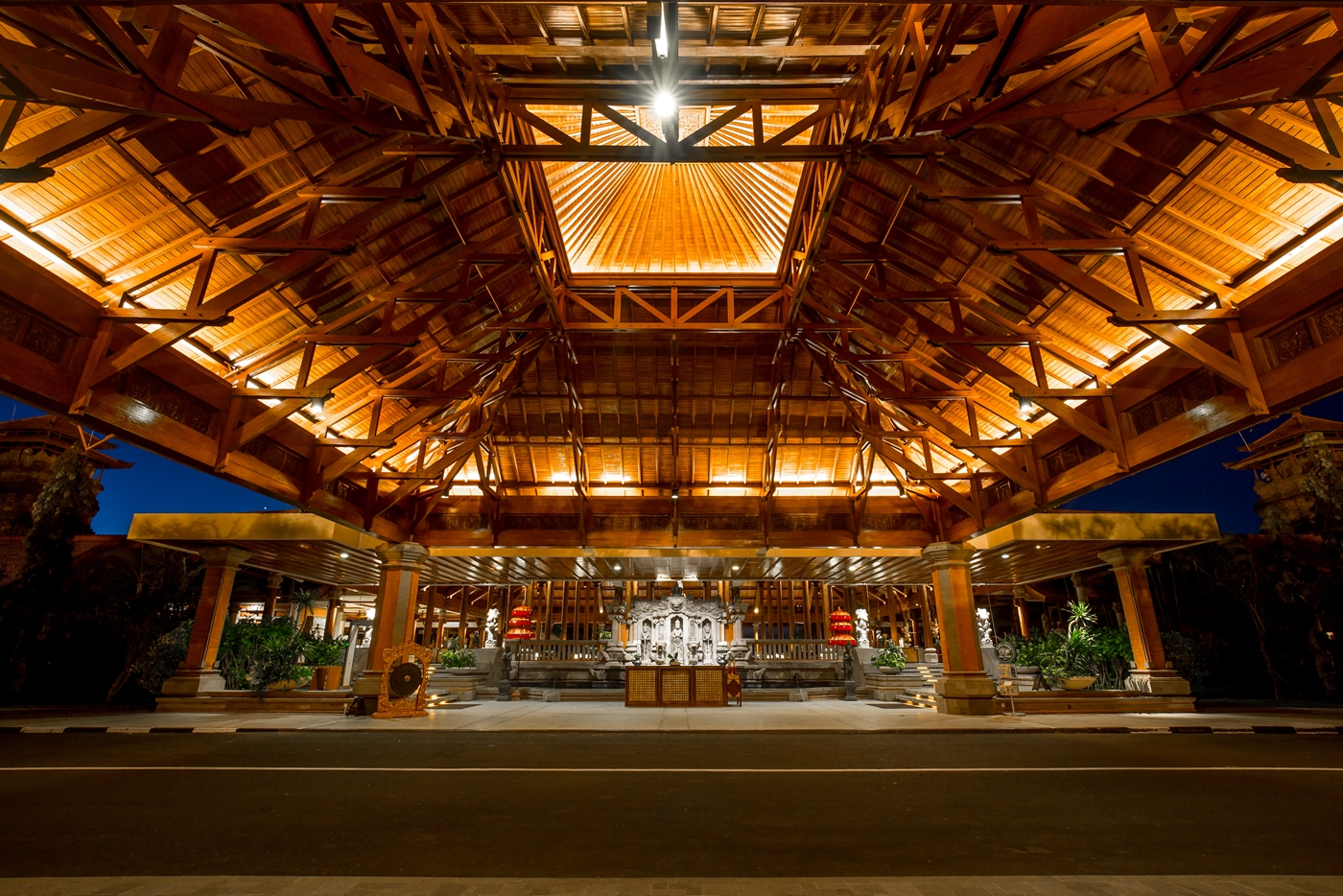 王宮を思わせる壮大なロビー(バリ島のホテルの中でもロビーの面積は1番広いのではないか?!)から、ゲストがリラックスしてくつろげる居心地の良い中庭やパビリオンに至るまで、よく見てみると古代叙事詩、ラマヤナ物語のストーリーとバリ島の水の宮殿をモチーフにした装飾を見ることが出来ます。おもてなしの精神とインドネシアの伝統への敬意を表したものなのだそう。茅葺き、竹、石などの伝統的なバリの素材を使い、バリ式の建築様式を取り入れ、手先の器用なバリ島の人々の手によりつくられた彫刻や木彫り等バリ島の伝統文化をしっかりと表現したホテルになっています。