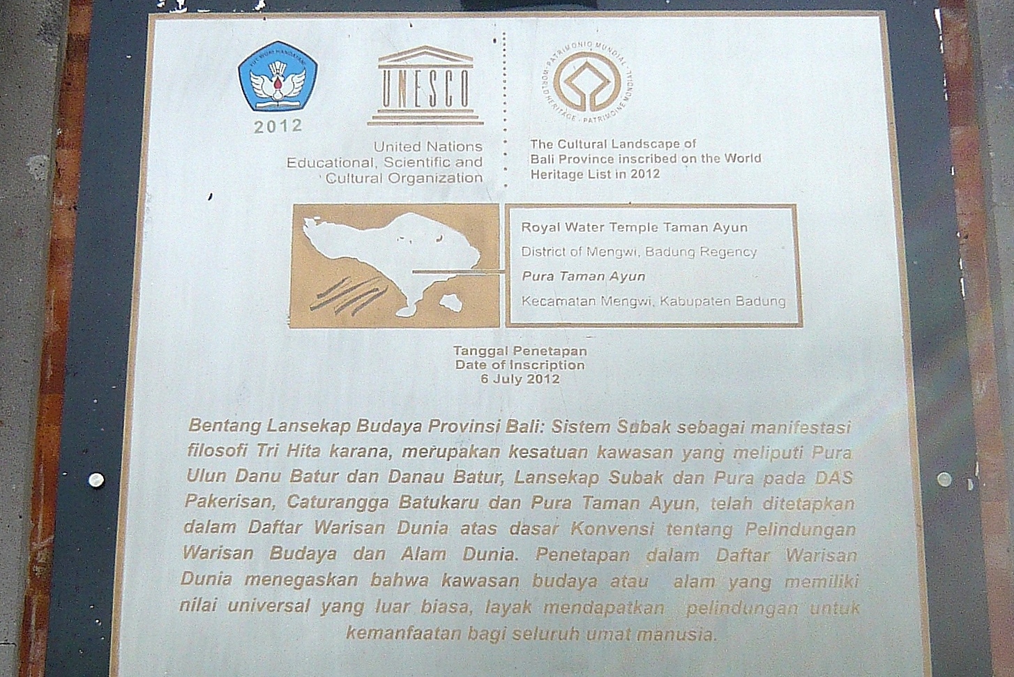 また、2012年にバリ島の「バリ州の文化的景観:トリ・ヒタ・カラナ哲学に基づくスバック灌漑システム」が世界遺産として登録され、タマン・アユン寺院を含む19,500ヘクタールに及ぶ5つの棚田地域にある、
