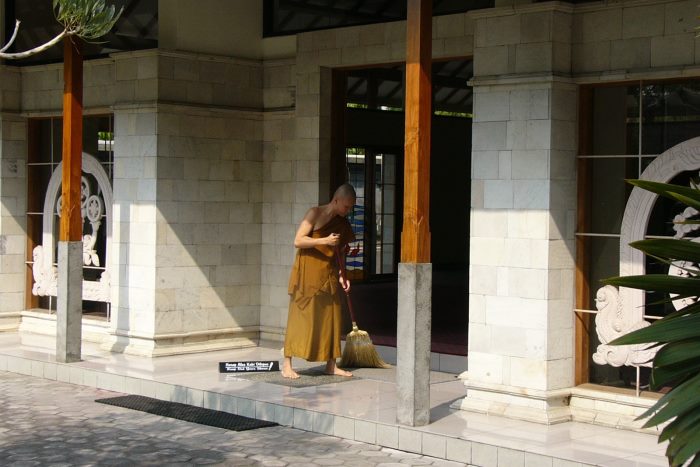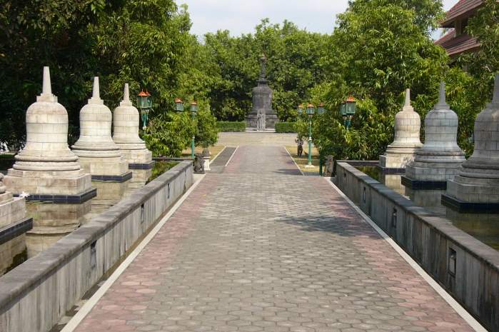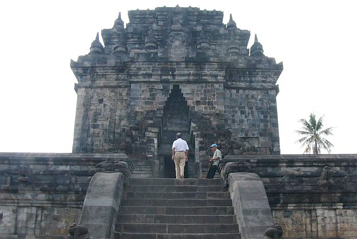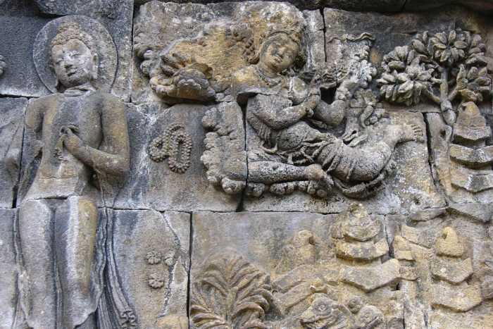 ボロブドゥールの東約3kmに位置するムンドゥット寺院はブッダの生誕地である北西の方向を向いて建てられた仏教寺院。敷地にはとても大きな菩提樹があり、寺院の中には、3つの仏像があります。観世音菩薩、シャムニブッダ象、金剛手菩薩象。花や線香がたかれていて仏教寺院の雰囲気。外壁、内壁、基壇に施されているレリーフも見所のひとつです。となりにある現代版メンドゥット寺院では仏教徒が修行していました。仏教になじみのある日本人にとって身近に感じられる寺院ではないかと思います。