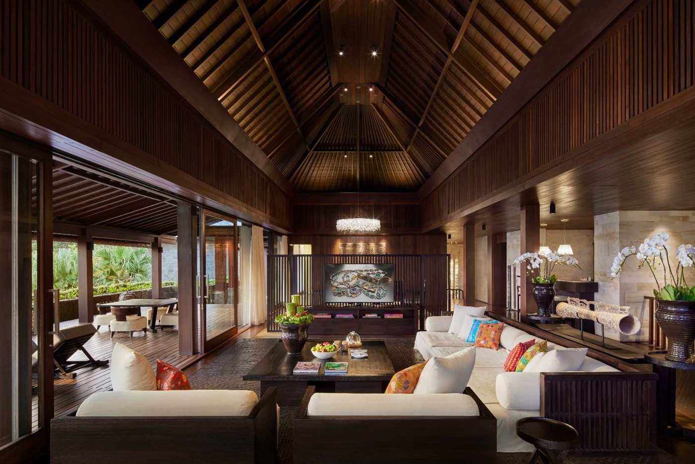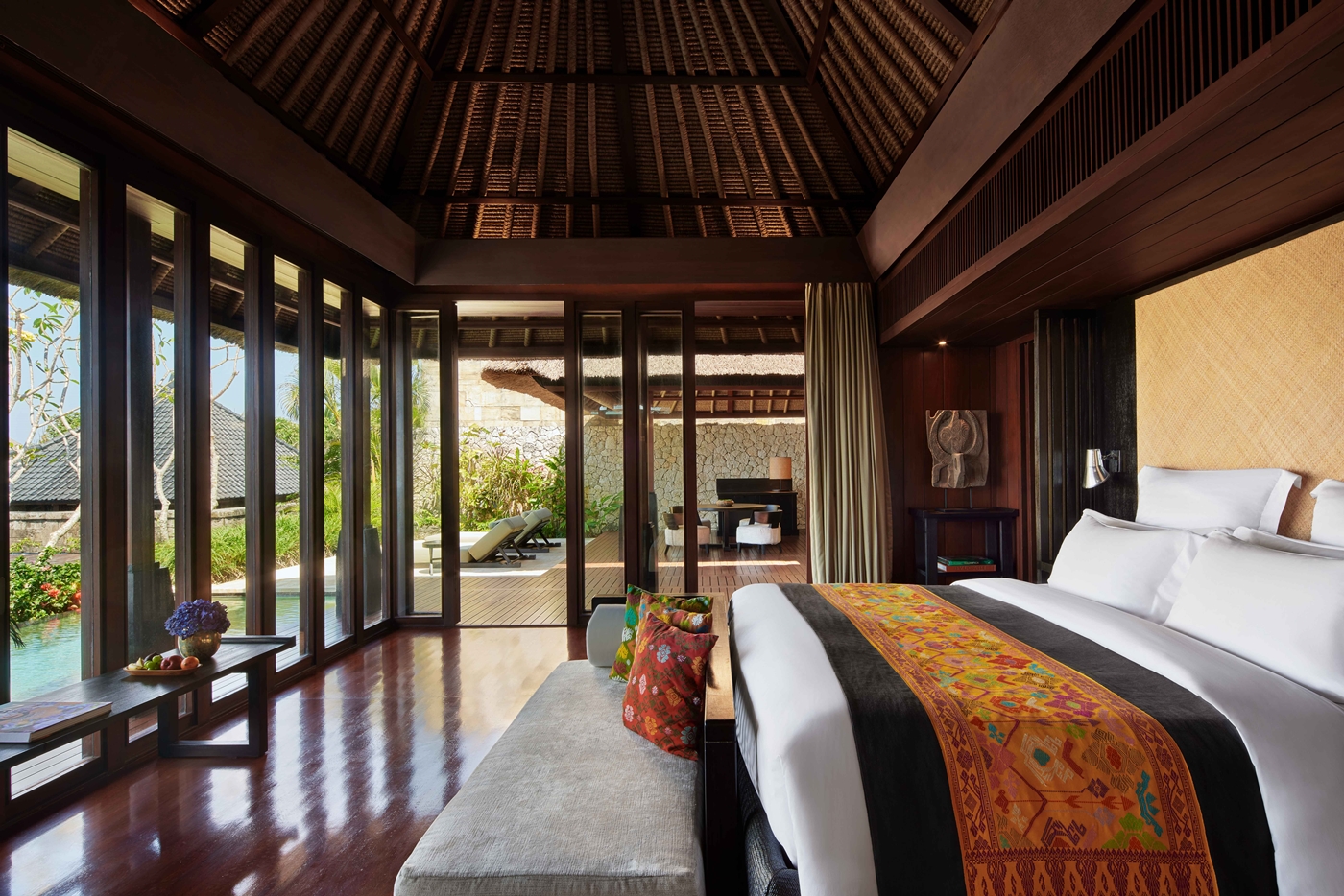 ブルガリヴィラの上をゆく、マンションは3ベッドルームまたは5ベッドルームのタイプがあります。まさに大豪邸。。。ホテルの中にまた別のホテルがあるかのようなスケールで、お客様専用のエントランスから入ります。専属のバトラーが、お荷物の整理、バーやキッチンからの飲み物のサービス、ダイニング・ルームの光り輝くクリスタルシャンデリアの下でのお食事の準備などをサポートします。さらにバトラーは、屋外でのプライベート・バーベキューの準備、お客様専用のスパ・パビリオンでのカップルのマッサージの手配なども承ります。 2つの大階段に加え、エレベーターでも3室のスイートルームにアクセスすることができます。各スイートルームには、高々としたガラスドアがあるおかげで自然光が差し込みます。バリ島の王族が古くから使ってきた豊かな木材、そして宝石のような色調の織物がよく映えます。各スイートルームには、屋外リビングのほかに屋内ラウンジが完備されています。広々としたクローゼットを通り抜けると、巨大なスイート・バスルームが広がります。レイアウトはルームごとに異なりますが、職人技が光るタイル張りのシャワールームや屋外シャワーと共に、大理石のモザイクで覆われたバスタブを完備し、バスソルトとブルガリ独自のフレグランスやバスコレクションが備えられています。