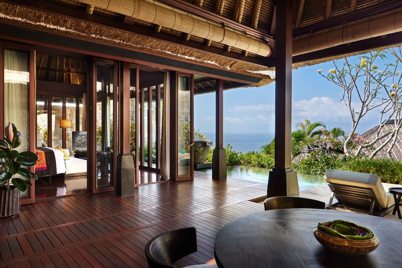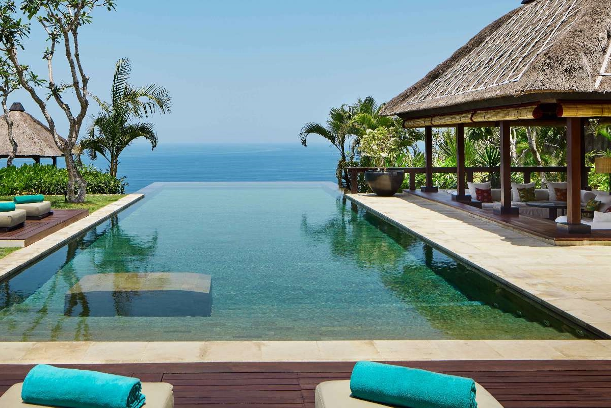 屋外には、バリ島北部のライステラスからインスピレーションを得たユニークな形の二層式プールがあります。広いデッキにはパラソル付きのサンベッドが並び、日陰にある屋外リビングルームには豪華なシーティングスペースが豊富に備えられ、鳥のさえずりや上段のプールから下段に流れ落ちる水の音を耳にすることができます。