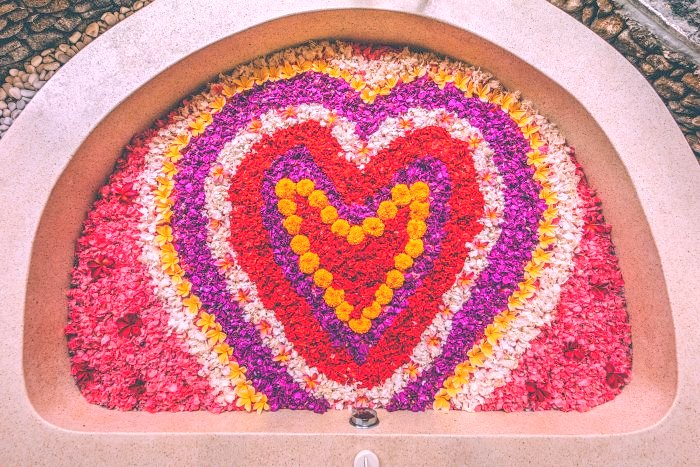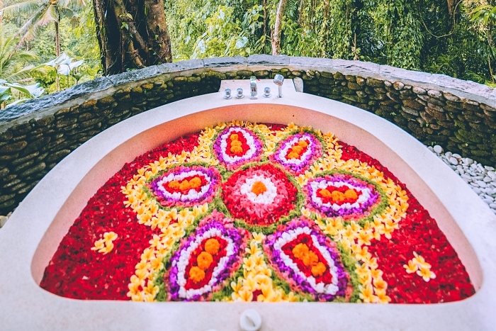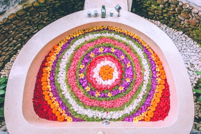 バリ島ではどのスパでもフラワーバスがメニューにありますが、スパごとにお花の種類やデコレーション、そのセッティングの仕方が異なり、見比べるのがとても楽しいです。