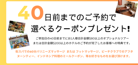 オプショナルツアー / 食べる / スパ 2025年2月20日 マイマイウェブでお得に旅しよう、40日前までの早期予約特典選べるクーポン プレゼント! 皆さん、こんにちは。今日は、新しくスタートした早期予約特典をご紹介します。 マイマイウェブでは、40日前までに. . .