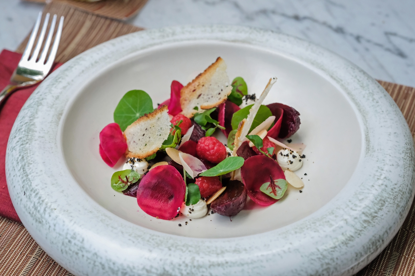 ビーツとゴートチーズ。サラク、ラズベリー、アーモンド、オリーブがビーツの甘味を引き立てます。