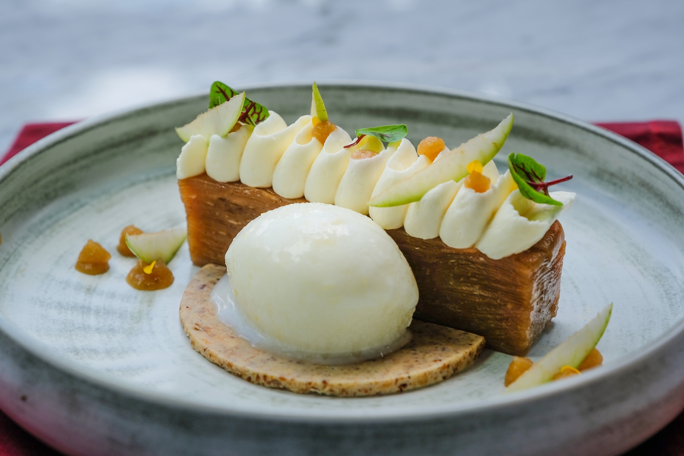 レイヤード アップル クランブル。シナモンの香りが口に広がる優しい味わい。ココナッツのソルベを添えて。
