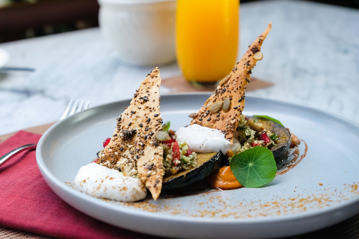 ローストパンプキン。カリフラワータブレ、パプリカのピューレ、クルミ、サワークリーム、クリームチーズ、マルチシードラヴァシュと共に。