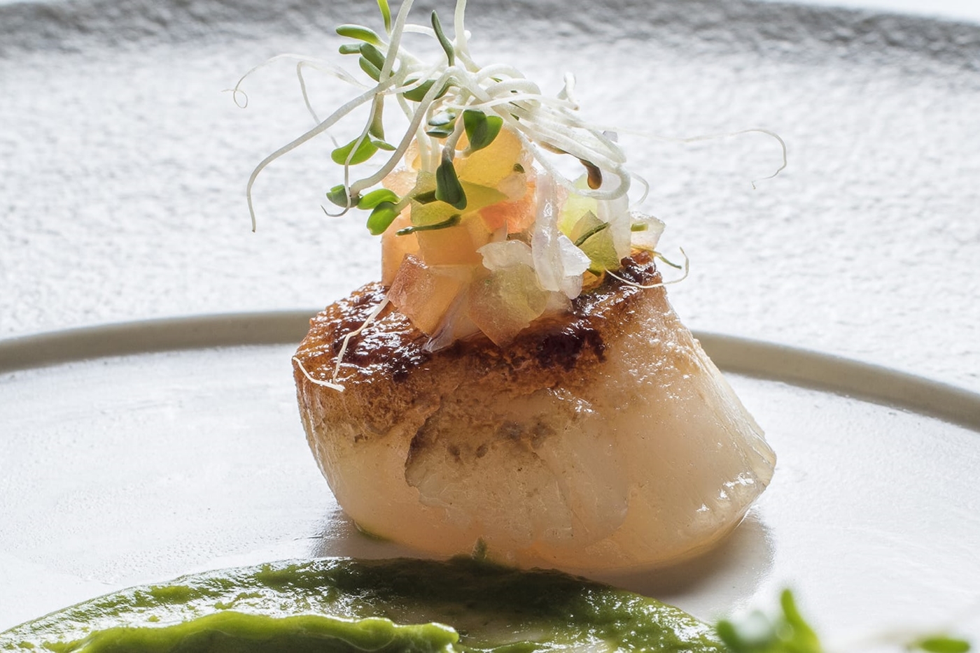こちらは新鮮なエビに、カリオソースを合わせた料理。白菜のピクルス、ヤングマンゴー、ヒカマ、地元のハーブの風味で絶妙な食感。