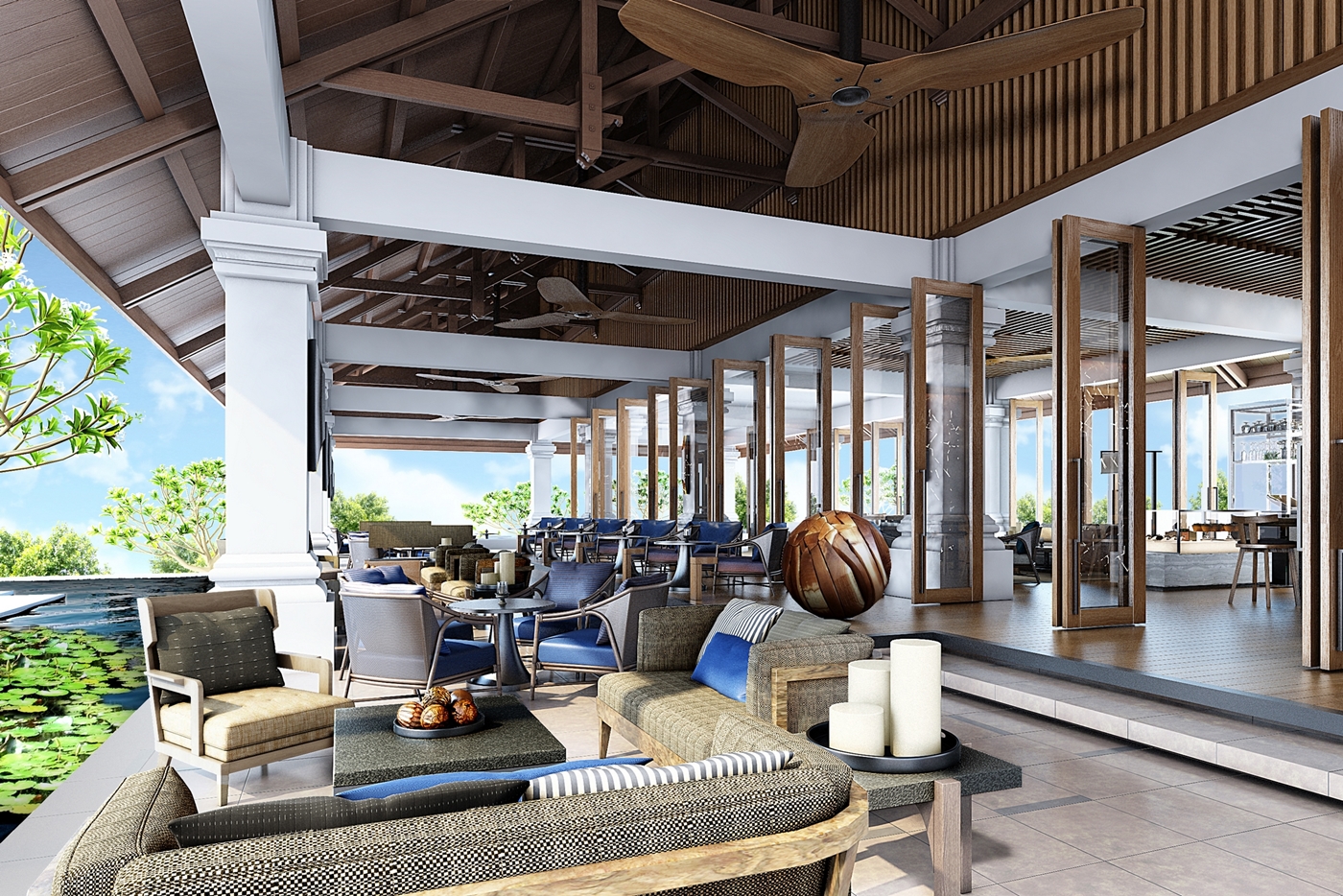 潮風が吹き抜ける解放感と池の清涼感に大理石。一瞬でリゾートライフに吸い込まれます。