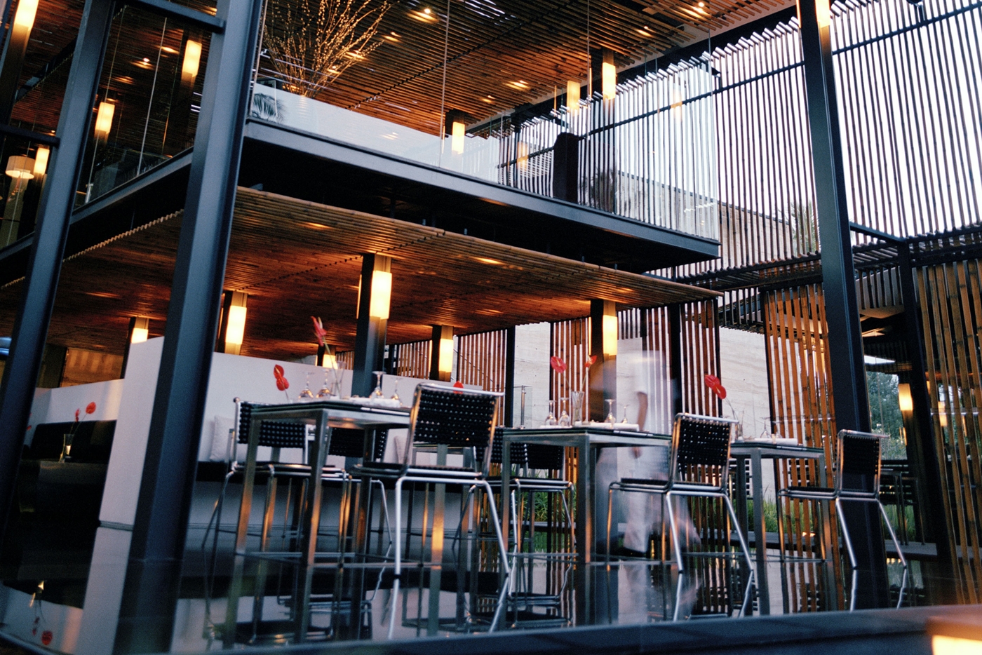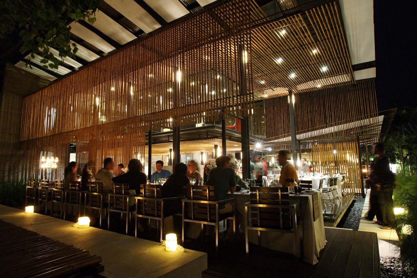 イタリア料理の ●ピアサン。バリ島の新鮮な旬の食材をイタリアの伝統的なレシピと、経験豊かなシェフのセンスで美しく仕上げたホームメイドパスタやピザ、上質なお肉、新鮮なシーフード、旬の野菜がお楽しみいただけます。建築賞も受賞したレストランは竹とガラスという正反対の素材で現代アートのようなスタイリッシュなデザインになっています。
