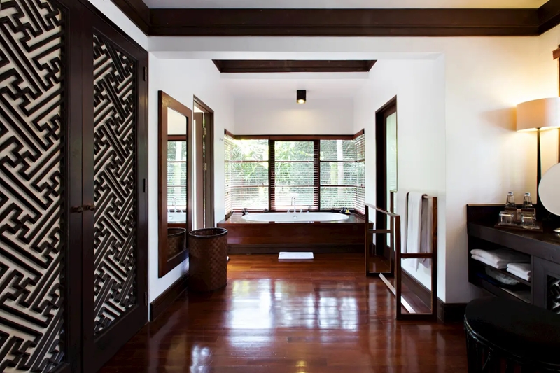 カユマニス スパのスパルームは、深い緑の森を流れる川沿いに建てられた5棟の高床式のスパパビリオン。